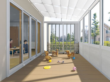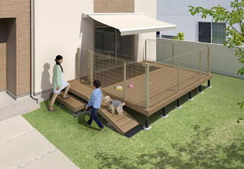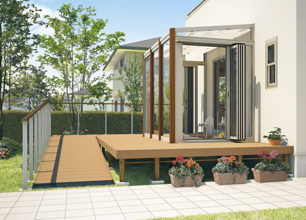 リビングからつながるウッドデッキ,ペットのいる御家庭用に。また、足の負担を和らげるスロープ付きデッキ、雨風を防ぐ屋根付き等、各種ご相談に応じた提案をさせていただきます。